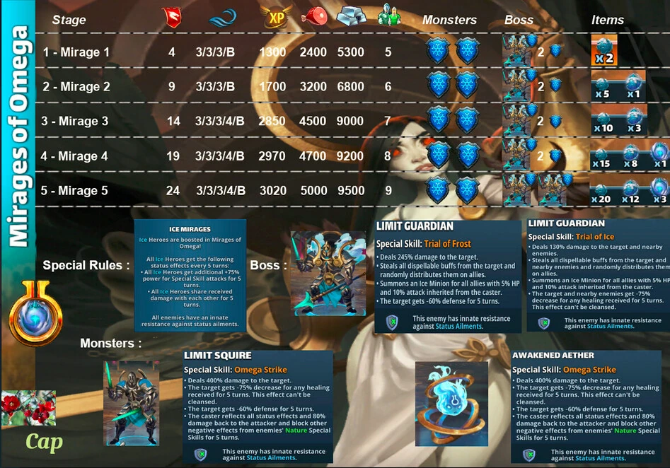The Mirages of Omega: "Limit Breaker Quest" is a unique monthly, i. e. later 4-weekly quest introduced in June 2021 (version 39) to provide Aethers, which allow to further level fully maxed heroes (see Hero Information#Limit Break). Each event lasts 3 days from Monday and yields Aethers of one element, rotating monthly (in the order of tabs/guides below, February 2023 will start the new round from